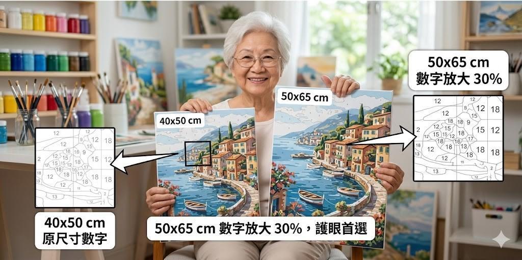 挑選數字油畫時,「線條密度」比「顏色數量」更能決定難度。例如只有 18 色的梵谷名畫,因筆觸碎、格子細,難度遠高於 36 色的現代插畫。若擔心視力負擔或送禮給長輩,建議優先選擇 50x65 cm 大尺寸,利用「物理外掛」原理放大格子,讓繪畫更輕鬆。