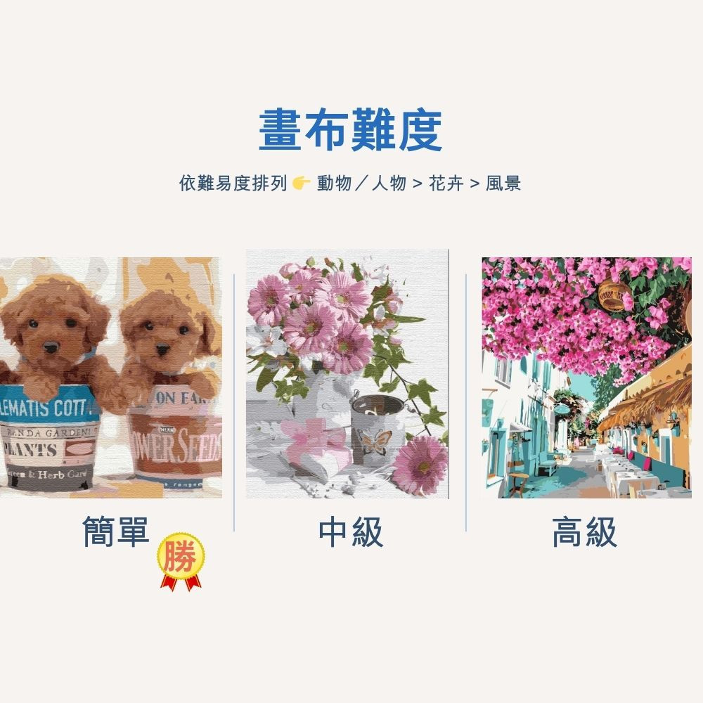 (2)選主題難度**:依難易度排列 👉 動物/人物 > 花卉 > 風景。